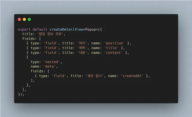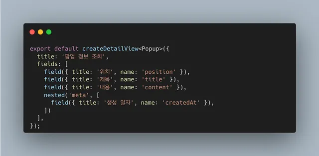 예시를 위해 작성해서 당시 시도했던 코드와는 좀 다르지만, 큰 틀에서는 이런 구조를 원했다. meta 라는 객체에 생성 일시와 같은 데이터가 있다고 가정하고, nested 로 해당 필드명을 사용하면, 두번째 배열 내에서는 meta 객체를 타입으로 사용해서 field 함수가 적절하게 타입 추론을 해줄 것을 기대했다.