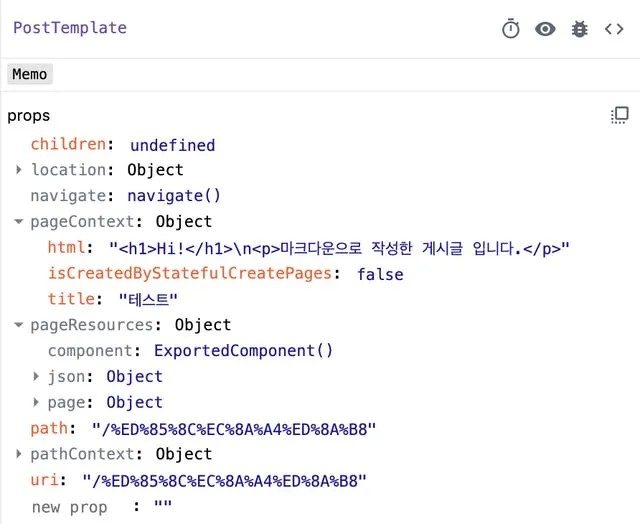 템플릿 컴포넌트에서 접근 시 필요한 내용은 pageContext 라고 판단되었고, 그 중 isCreatedByStatefulCreatePages 은 Gatsby 에서 자동으로 넘겨주는 항목입니다. 그 외에 html 이나 title 같은 항목을 임의로 지정할 수 있도록 제너릭으로 만들어 두었습니다.
