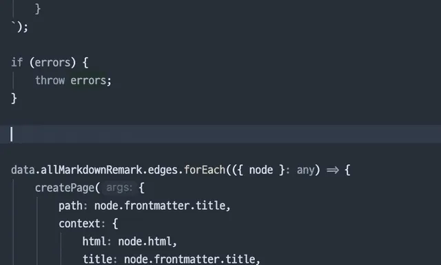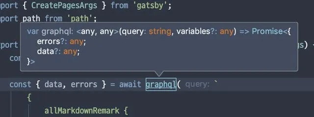 createPages 함수 내에서 allMarkdownRemark 스키마에 대해 조회할 때 타입 추적이 되지 않는 문제가 있습니다. 쿼리문에 대한 자동 완성은 GraphiQL 내에서 확인하는 것으로 차치하더라도(이는 GraphQL Introspection 기능을 지원하는 플러그인을 사용하면 해결됩니다), 쿼리 이후 데이터를 핸들링 할 때 any 로 추적이 되면 타입스크립트의 장점을 발휘 할 수 없는 상황이죠. 😢