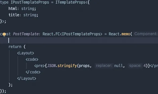 지난번에 간단하게 작성했던 PostTemplate 컴포넌트는 props 인터페이스가 지정되지 않은 상태입니다. 그렇다면 이 컴포넌트에 어떤 데이터가 오는지 어떻게 알 수 있을까요? gatsby 패키지에 포함되어 있는 타입 선언 파일 중에 ReplaceComponentRendererArgs 라는 인터페이스가 있습니다.