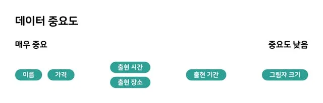 스프레드시트 도감이 보기는 어려워도 언제(시간/월), 어디서, 어떤 그림자로 나타나는지 알 수 있는 것에 비하면, 지금의 화면에서는 이름과 가격을 제외한 나머지 정보는 제공하고 있지 않기 때문이었다. 그래서 어떤 정보가 중요한지, 데이터의 중요도를 정리하기도 했다.