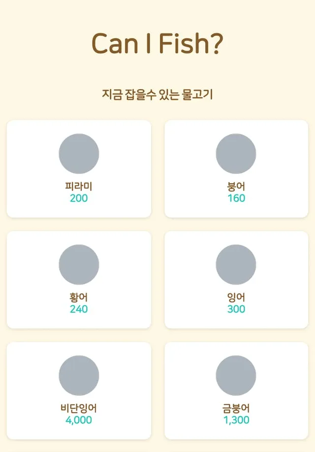 아쉬운 점은 그러한 정보들이 스프레드시트로 공유되고 있었고, 지금 내가 어떤 물고기를 잡을 수 있는지 확인하는 방법은 전적으로 수동으로 확인해야 했다.