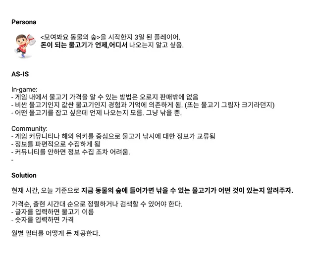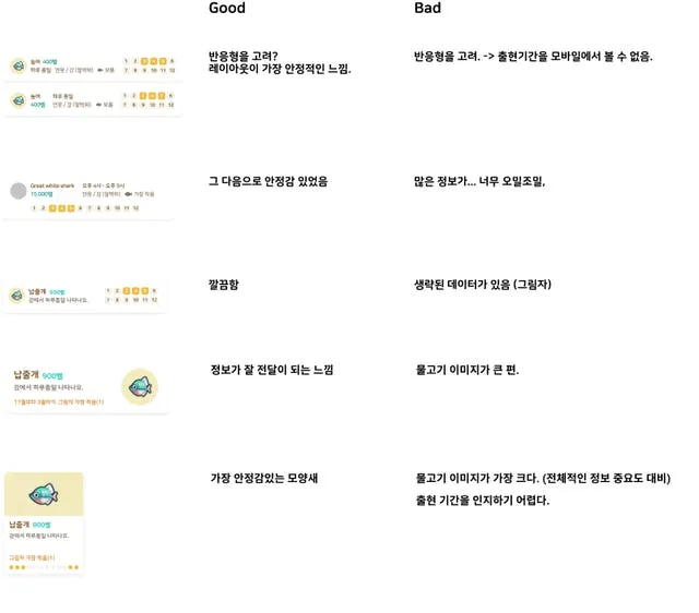 사실 이름과 가격을 제외한 나머지 정보 중, 하나라도 제공되지 않는다면 원하는 물고기를 잡는 것은 어려운 일이다. 중요도 순으로 나눈 이유는 컴포넌트를 다시 디자인할 때, 효과적으로 정보를 잘 전달할 수 있도록 고려하기 위해서였다.