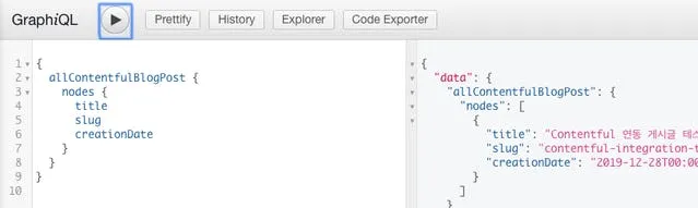추가한 뒤, 다시 실행하면 아까와 같은 오류는 해결되고, 정상적으로 실행이 되는 것을 볼 수 있다. 또한 GraphiQL에서allContentfulBlogPost를 확인할 수 있다.