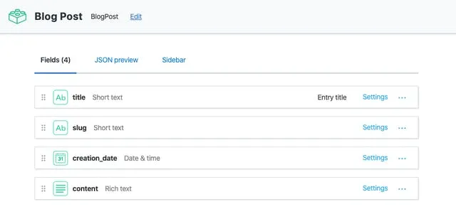 기본적인 사용법 설명은 생략하고, 아래 필드를 포함하는 콘텐츠 모델을 만들었다.