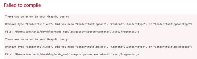 앞서 추가한 로컬 환경 변수를 이용해 정상적으로 Contentful에서 콘텐츠를 가져와 Gatsby 내부 GraphQL에 추가되는지 확인 해 보자. 그러기 위해선 gatsby develop을 실행해 보면 되는데, 이런 오류가 나타난다.