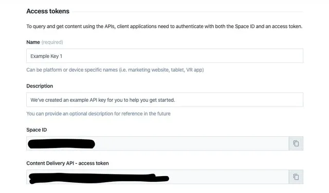 CONTENTFUL_SPACE_ID와 CONTENTFUL_ACCESS_TOKEN을 저장해야 하는데, 두 항목은 Contentful > Settings > API Keys 에서 확인할 수 있다. 최초에 Example Key 1 이라고 추가되어 있는게 있다. 이걸 그대로 사용해도 좋고, 새로 생성해도 된다.