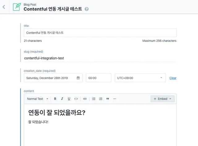생성된 모델을 사용해서, Contentful 연동을 위한 콘텐츠를 하나 추가했다.